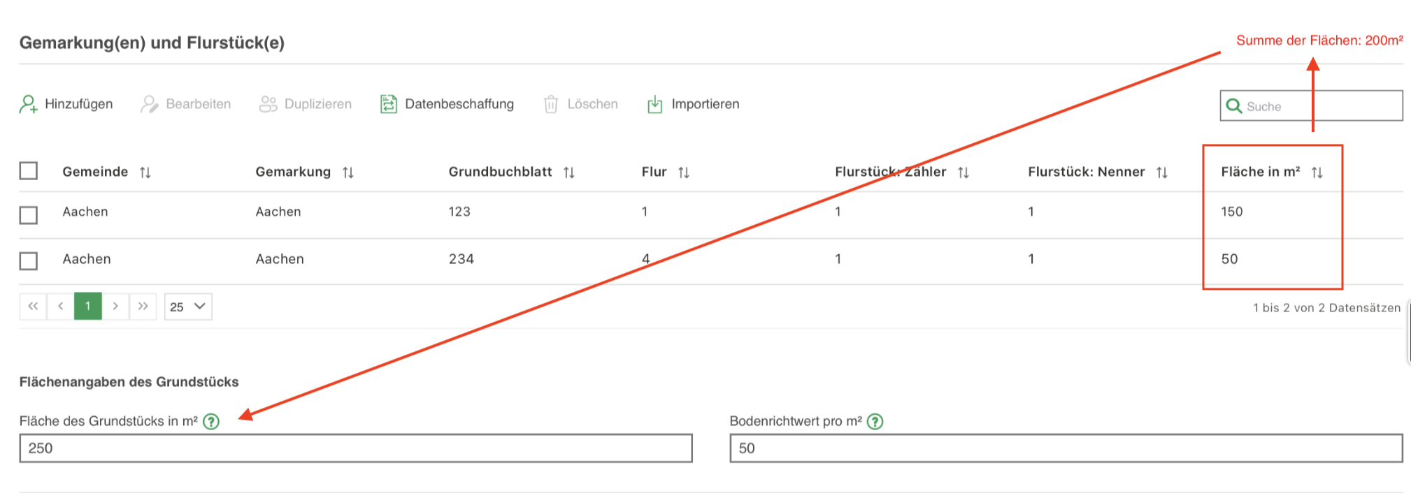 Die Summe der im Hauptvordruck angegebenen, zur wirtschaftlichen Einheit gehörenden Flächen (Fläche des Grundstücks in m² multipliziert mit dem Anteil) entspricht nicht der Summe der in der Anlage Grundstück angegebenen Flächen des Grund und Bodens.