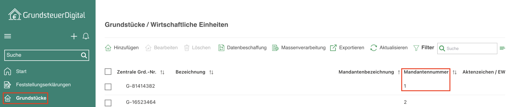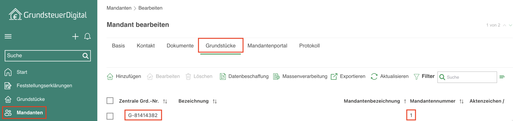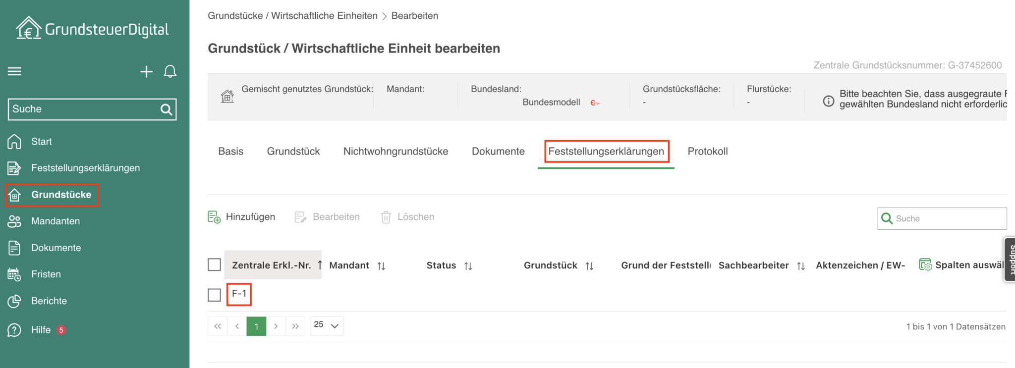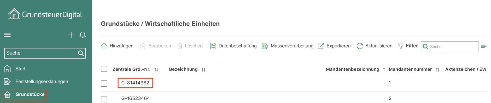 Wenn Sie im Spaltenmenü auf Grundstück gehen, dieses öffnen und dort auf den Reiter Feststellungserklärung gehen, sehen Sie ebenfalls die Nummer.