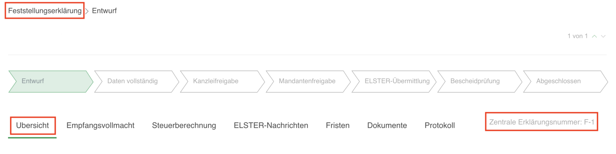 Feststellungserklärung öffnen, im Reiter Übersicht